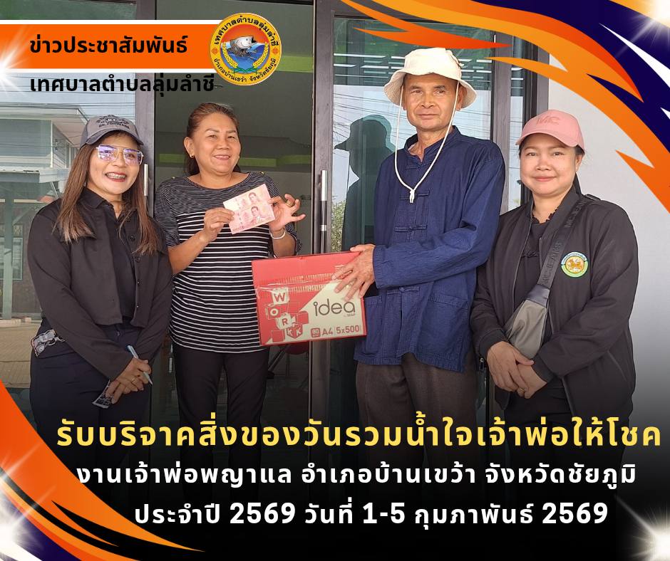 วันที่ 19 มกราคม 2569 เวลา 13.30 น.นายธวัชชัย จันทร์เจริญ นายกเทศมนตรีตำบลลุ่มลำชี มอบหมาย นางขวัญพนม สถิตย์ชัยผู้อำนวยการกองการศึกษา เทศบาลตำบลลุ่มลำชี พร้อมด้วยข้าราชการและพนักงานเจ้าหน้าที่ เข้าร่วมกับส่วนราชการอำเภอบ้านเขว้า และ กาชาดบ้านเขว้า ออกประชาสัมพันธ์รับบริจาคเงินและสิ่งของวันรวมน้ำใจเจ้าพ่อให้โชคสำหรับงาน “ฉลองอนุสาวรีย์เจ้าพ่อพญาแลประจำอำเภอบ้านเขว้าและงานบุญลอมข้าวใหญ่ - ส่งเสริมการท่องเที่ยวเทศกาลไหมและของดีบ้านเขว้า ประจำปี 25669 โดยเทศบาลตำบลลุ่มลำชี ได้รับเป็นเจ้าภาพในส่วน ร้านกาชาดเจ้าพ่อให้โชคประจำปี2569 ระหว่างวันที่ 1-5 กุมภาพันธ์ 2569