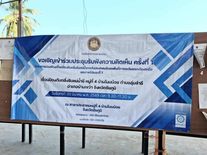 30 มีนาคม 2569 เวลา 09.30 น. นายธวัชชัย จันทร์เจริญ นายกเทศมนตรีตำบลลุ่มลำชีประธานเปิดประชุม พร้อมด้วยนายอุทัย บำรุงนายสมนึก ประสานเนตร. รองนายกเทศมนตรี คณะผู้บริหาร นายสมชาย ศิริ หัวหน้าฝ่ายแบบแผนและก่อสร้าง พร้อมทีมงานกองช่างเทศบาล นายรัตนากร งีสันเทียะ กำนันตำบลลุ่มลำชีร่วมประชุมเสนอ รับฟัง เสนอความคิดเห็น ครั้งที่ 1 โครงการก่อสร้างเขื่อนป้องกันตลิ่ง ริมแม่น้ำภายในประเทศ บริเวณพื่นที่ภาคตะวันอแกเฉียงเหนือณ ศาลาประชาคมหมู่ที่ 4 บ้านโนนน้อยโดยมีชาวบ้าน เข้าร่วมรับฟังพร้อมเสนอความคิดเห็นดังกล่าว