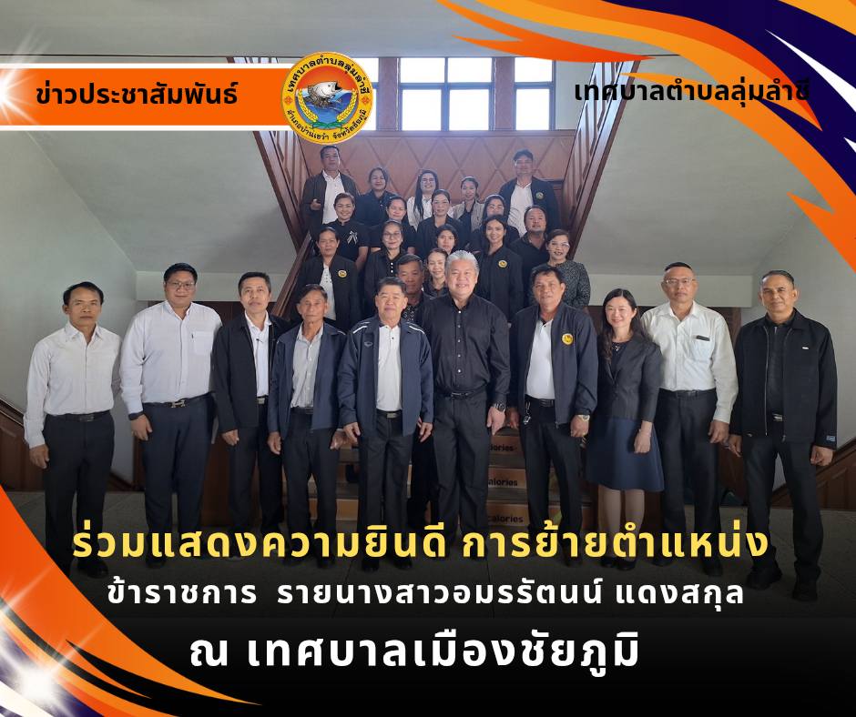 นายธวัชชัย จันทร์เจริญ นายกเทศมนตรีตำบลลุ่มลำชี รองนายกเทศมนตรี คณะผู้บริหาร รองปลัดเทศบาล ร่วมด้วย หัวหน้าส่วนราชการพนักงาน เทศบาลตำบลลุ่มลำชีร่วมแสดงความยินดี กับนางสาวอมรรัตน์แดงสกุล เนื่องในโอกาส ไปดำรงตำแหน่ง หัวหน้าฝ่ายบริหารงานทั่วไป สังกัดเทศบาลเมืองชัยภูมิโดย ได้รับเกียรติต้อนรับจาก นายบรรยงค์ เกียรติก้องชูชัย นายกเทศมนตรีเมืองชัยภูมิพร้อมคณะ ผู้บริหาร