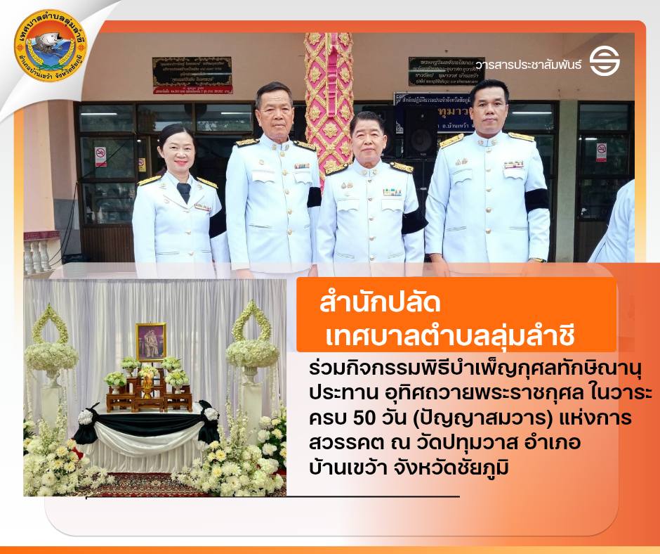 วันที่ 12 ธันวาคม 2568 เวลา 15.30 น.นายธวัชชัย จันทร์เจริญ นายกเทศมนตรีตำบลลุ่มลำชี พร้อมด้วยนายบุญกอง มณีรุ่งย์ที่ปรึกษานางสาวอมรรัตน์ แดงสกุล หัวหน้าฝ่ายแผนงานและงบประมาณ นายภานุวัฒ กุดนอก นักจัดการงานทั่วไปชำนาญการ และข้าราชการ พนักงานเจ้าหน้าที่ เทศบาลตำบลลุ่มลำชี ร่วมพิธีบำเพ็ญกุศลทักษิณานุประทานอุทิศถวายพระราชกุศล ในวาระครบ 50 วัน (ปัญญาสมวาร) แห่งการสวรรคตสมเด็จพระนางเจ้าสิริกิติ์ พระบรมราชินีนาถ พระบรมราชชนนีพันปีหลวง โดยมีนายพลวรรธนพล ศักดิ์วรรธนชัย นายอำเภอบ้านเขว้า เป็นประธานในพิธีฯ ณ วัดปทุมาวาส ตำบลบ้านเขว้า อำเภอบ้านเขว้า จังหวัดชัยภูมิ