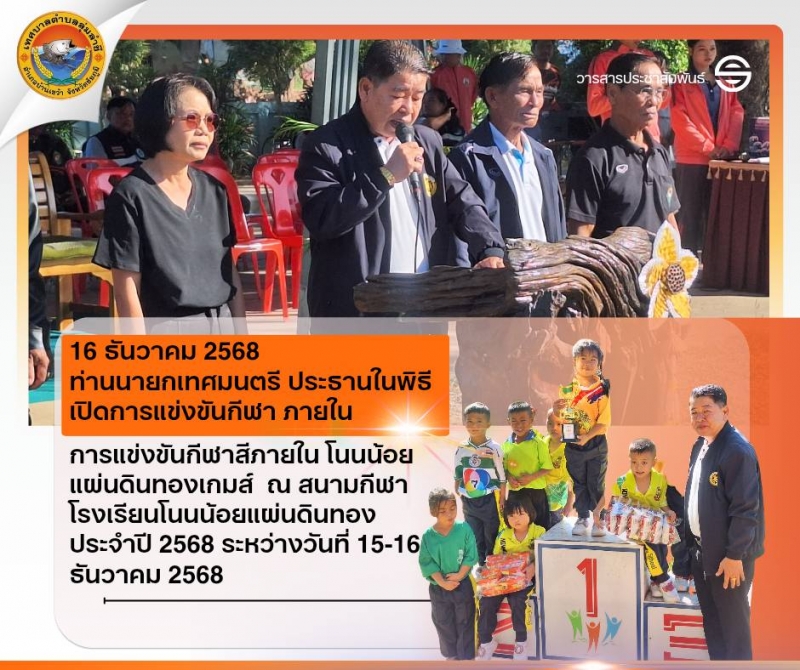 16 ธันวาคม 2568 เวลา 08.30 น.นายธวัชชัย จันทร์เจริญ นายกเทศมนตรีตำบลลุ่มลำชี ประธานในพิธีเปิดกิจกรรมการแข่งขันกีฬา ภายใน ประจำปีการศึกษา 2568 "โนนน้อยแผ่นดินทองเกมส์ระหว่างวันที่ 15-16ธันวาคม 2568 ณ สนามกีฬาโรงเรียนโนนน้อยแผ่นดินทอง โดยมีนายอุทัย บำรุงรองนายกเทศมนตรี นายสวง ถนอมสัตย์ เลขานุการ นายกเทศมนตรี นายบุญกอง มณีย์รุ่ง ที่ปรึกษานายกเทศมนตรี พร้อมด้วยผู้นำชุมชน สมาชิกสภาเทศบาลเข้าร่วมรับชมกิจกรรมดังกล่าวโดยท่านนายกเทศมนตรีได้มอบของที่ระลึกเป็นขวัญและกำลังใจให้กับ ลูกๆนักเรียน ในการแข่งขันกีฬาดังกล่าว