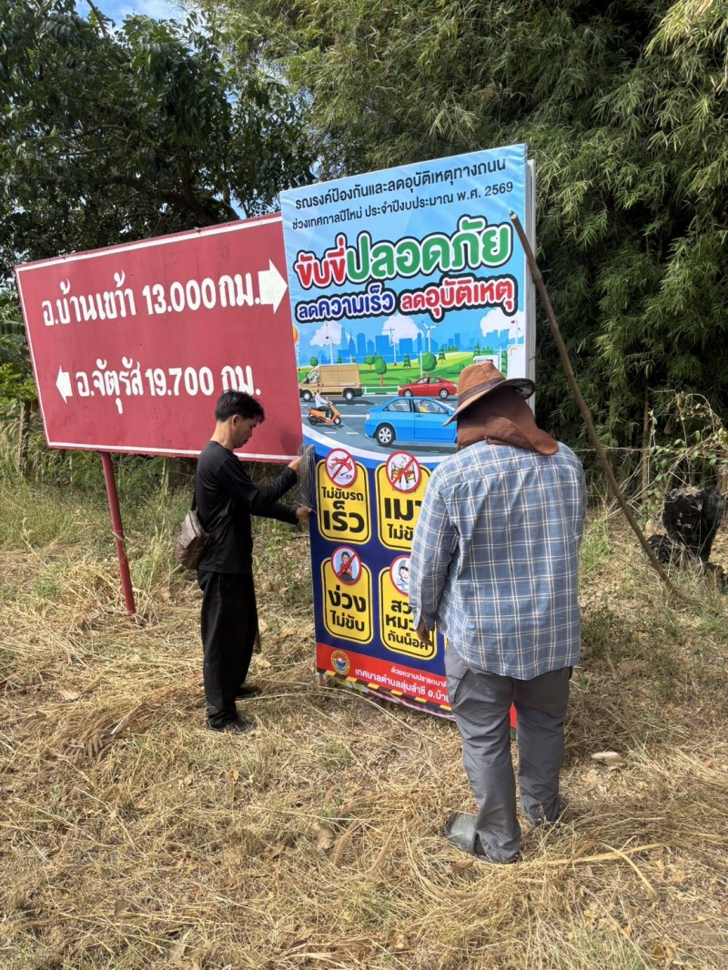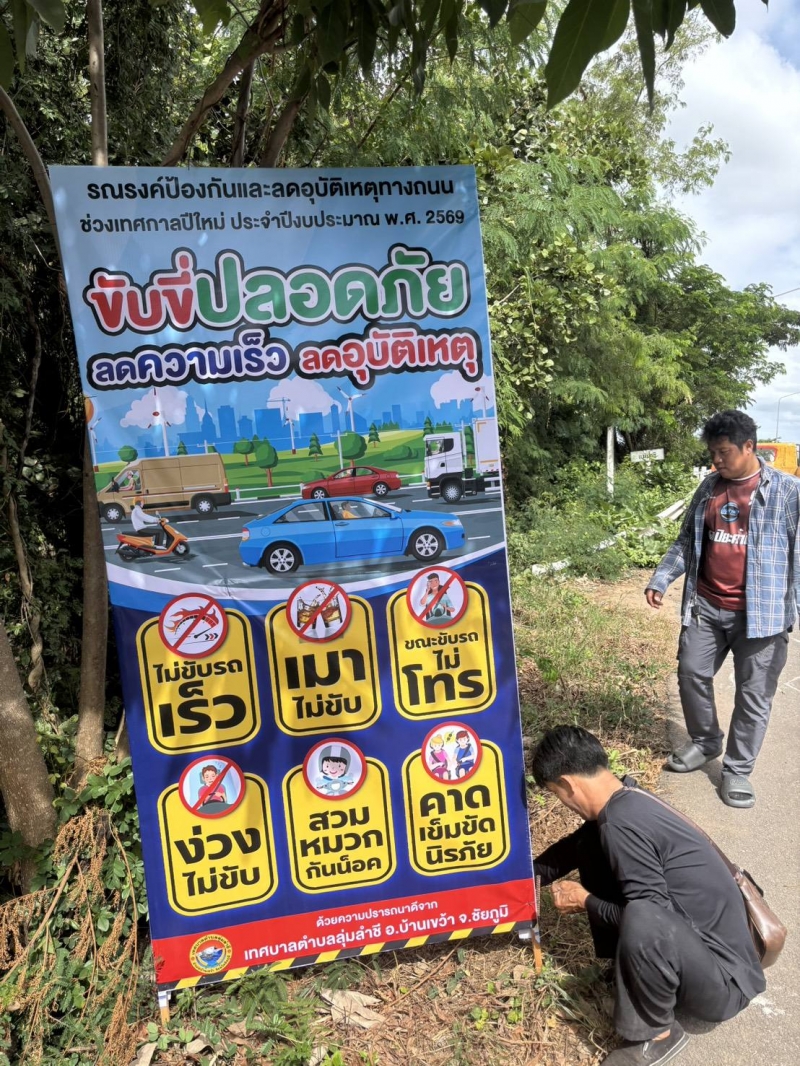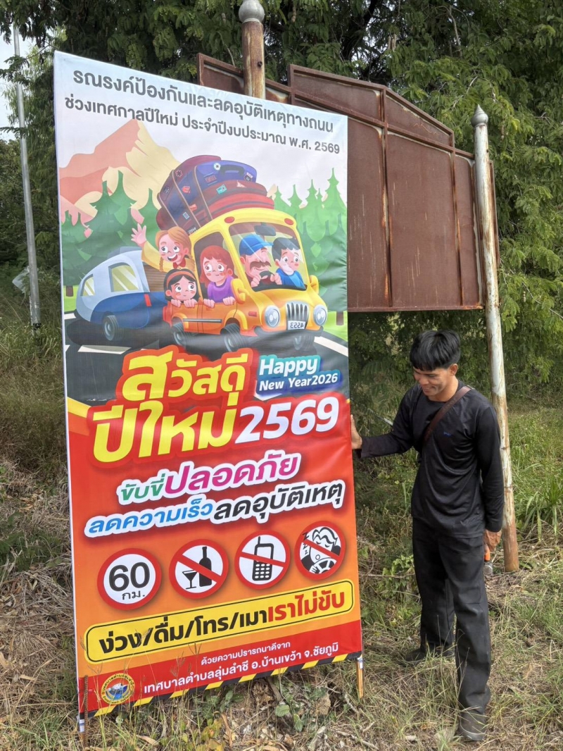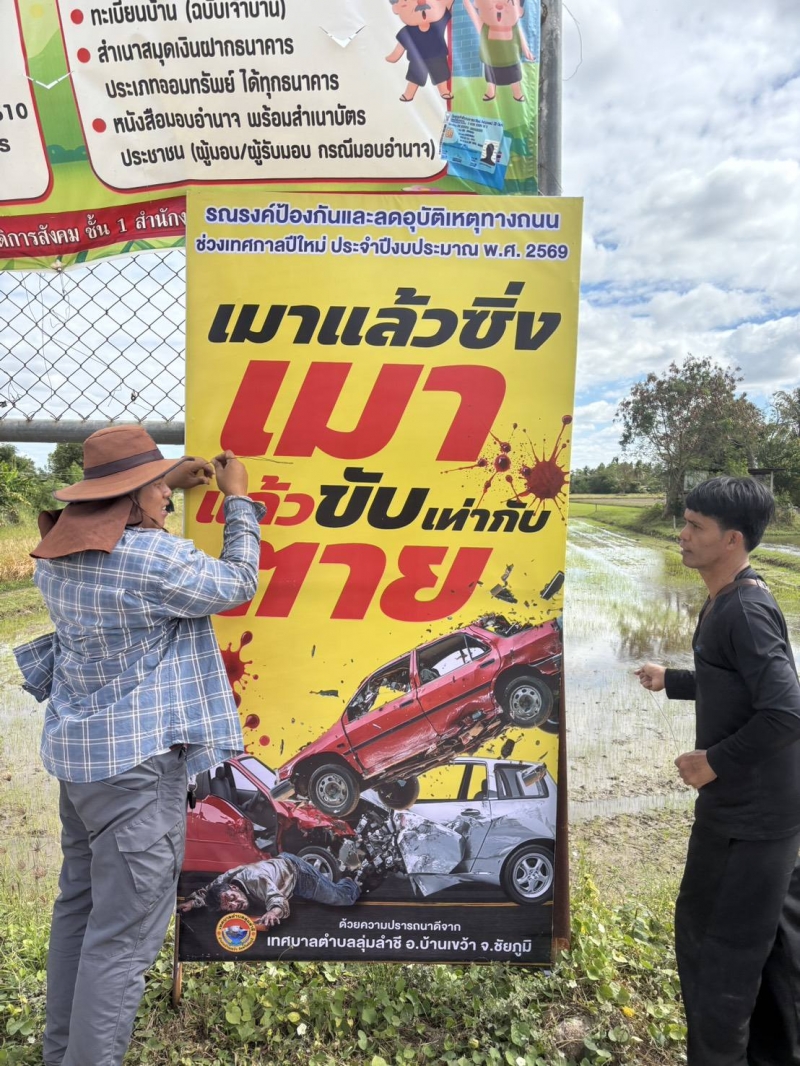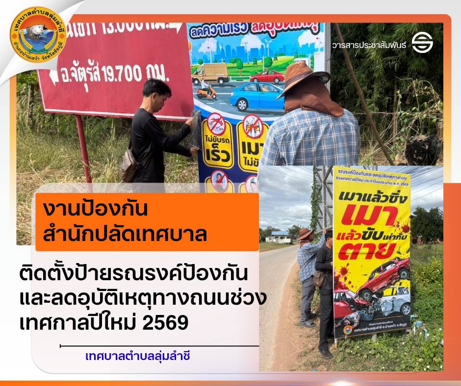 17 ธันวาคม2568 นายธวัชชัย จันทร์เจริญ นายกเทศมนตรีตำบลลุ่มลำชี มอบหมาย งานป้องกันสำนักปลัด ดำเนินงาน ติดตั้งป้ายรณรงค์ป้องกันและลดอุบัติเหตุทางถนนช่วงเทศกาลปีใหม่ 2569 ภายในเขตเทศบาลตำบลลุ่มลำชี
